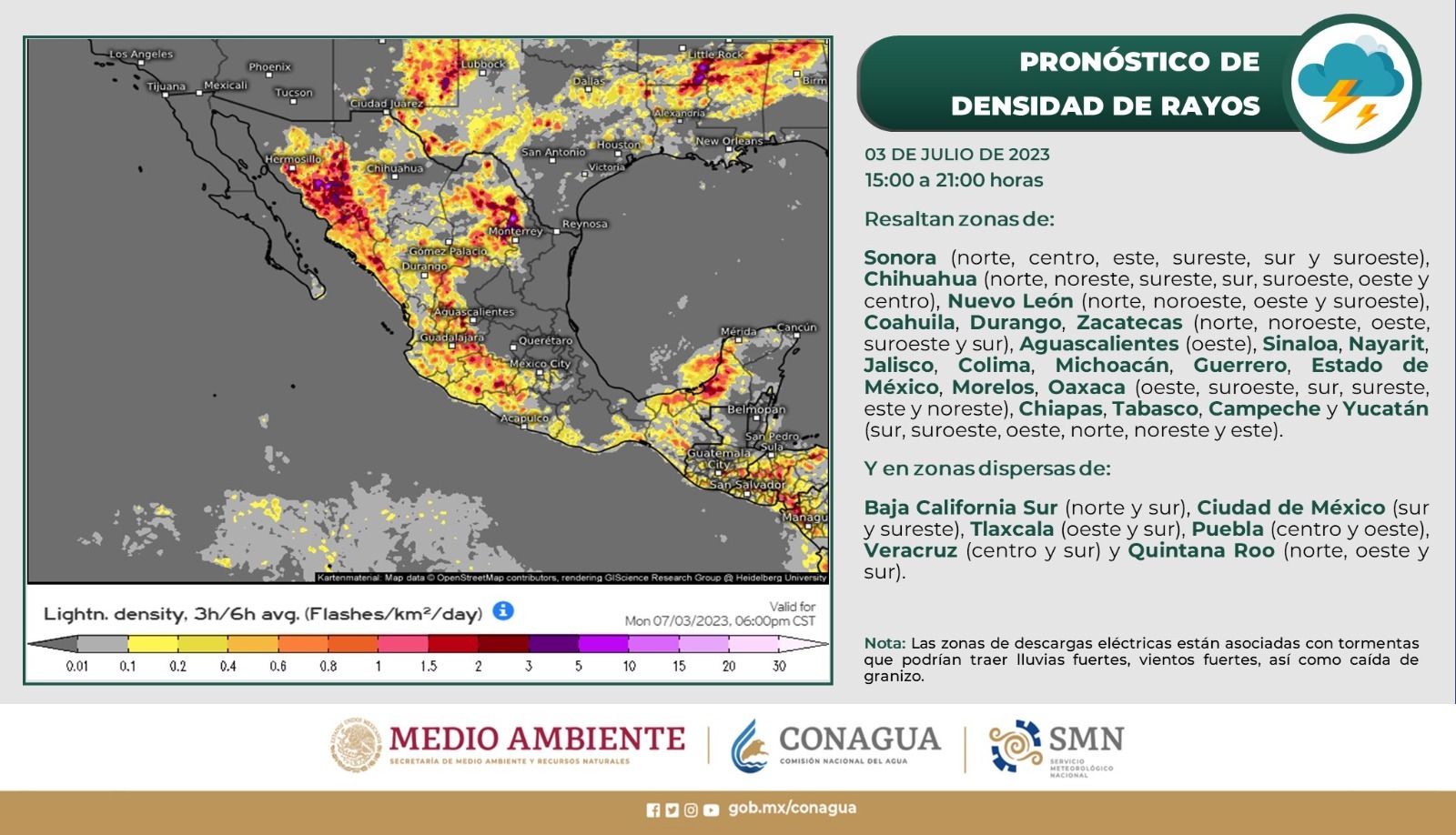 La Coordinación Estatal de Protección Civil (CEPC), informó que a partir de la tarde de este lunes 3 de julio, se prevé la presencia de lluvias que podrían estar acompañadas de granizo y tormentas eléctricas, por lo que hizo un llamado a la población a extremar precauciones.