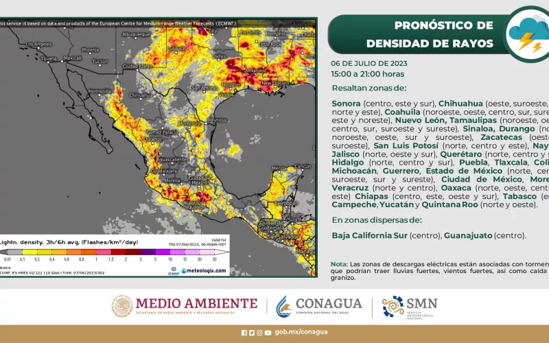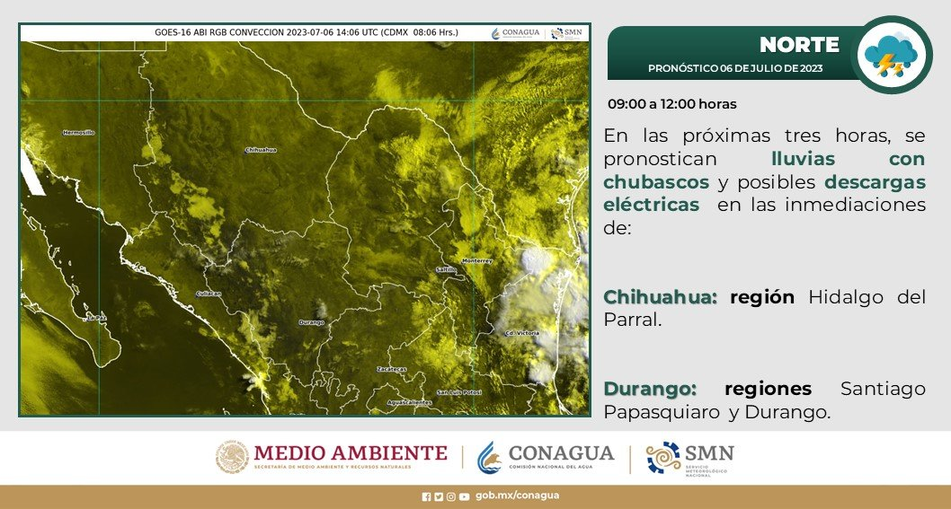 Para el viernes 7 de julio, las condiciones lluviosas se harán presentes de forma aislada, con intervalos de chubascos de 2.1 a 5 mm, en Batopilas, Guadalupe y Calvo, Ascensión, Janos, Casas Grandes, Madera, Temósachic, Ocampo, Guerrero, Bocoyna, Guachochi y Balleza. Estas precipitaciones podrían estar acompañadas de actividad eléctrica y posible caída de granizo.