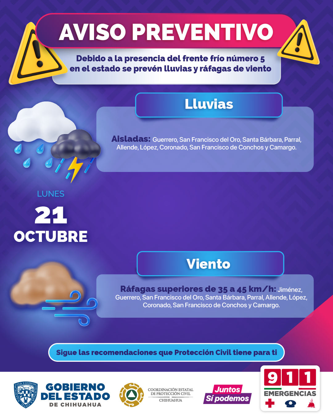 Para este lunes 21 de octubre las rachas de viento se esperan moderadas, de 35 a 45 kilómetros por hora. Además, en localidades como Guerrero, San Francisco del Oro, Santa Bárbara, Parral, Allende, López, Coronado, San Francisco de Conchos y Camargo, existe el pronóstico de lluvias aisladas.