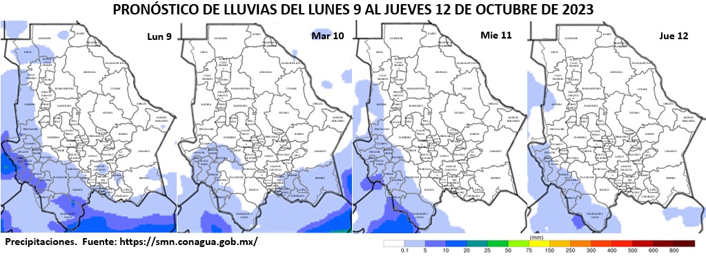 Además habrá lluvias aisladas en Ascensión, Janos, Casas Grandes, Madera, Temósachic, Guerrero, Bocoyna, Nonoava, Rosario, San Francisco del Oro, Santa Bárbara, Matamoros, Allende y Jiménez, mismas que pueden estar acompañadas de actividad eléctrica y posible caída de granizo.