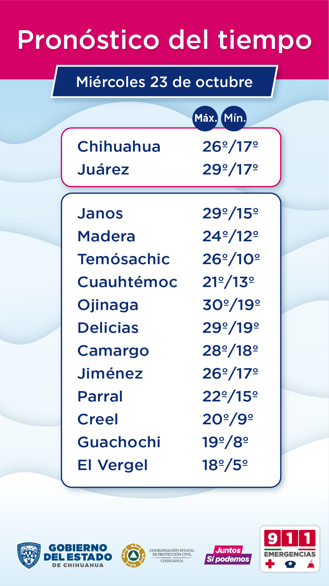 La Coordinación Estatal de Protección Civil (CEPC) dio a conocer que para este miércoles 23 de octubre y durante el resto de la semana, se prevén lluvias ligeras y ráfagas de viento en diversas zonas de la entidad, aunado a un clima cálido por las tardes, con temperaturas frías a frescas por las mañanas y noches, especialmente en la Sierra Tarahumara.