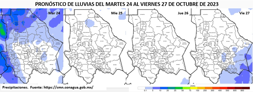 Se esperan lluvias de dispersas a moderadas con chubascos, de 5.1 a 25 milímetros (mm) en parte de las zonas norte, noroeste, oeste y suroeste, que incluyen Guadalupe, Juárez, Ahumada, Ascensión, Janos, Casas Grandes, Nuevo Casas Grandes, Madera, Galeana, Buenaventura, Moris, Uruachi, Chínipas, Guazapares y Urique.