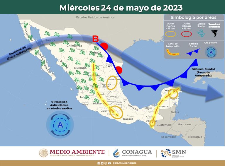 Para este lunes 22 de mayo, el nuevo frente frío se ubicará sobre el noreste del país, en interacción con la corriente en chorro, un canal de baja presión y la entrada de humedad procedente del Océano Pacífico, que favorecerá la presencia de rachas de vientos que pueden superar los 70 kilómetros por hora (km/h) particularmente en Ascensión, Janos, Nuevo Casas Grandes, Buenaventura, Namiquipa, Guerrero, Carichí, Nonoava, Balleza, Cuauhtémoc, San Francisco de Borja, Chihuahua, Camargo y Coyame.