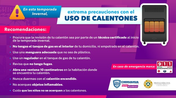 Debido a las bajas temperaturas que se presentan y que continuarán durante los próximos meses, el Gobierno del Estado a través de la Coordinación Estatal de Protección Civil, exhorta a la población a mantener las medidas de prevención por el manejo de calentones de gas, leña, estufas y cualquier aparato que sea usado para emitir calor.