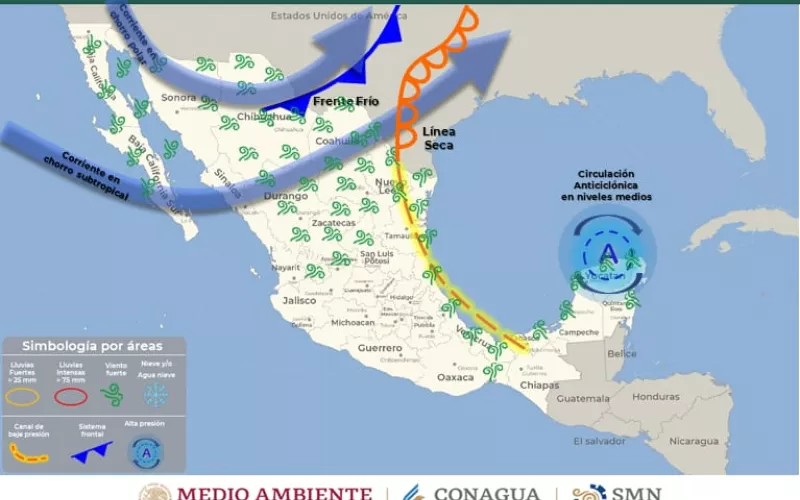 El posible ingreso del frente frío número 47 se aproximará sobre el noroeste del país durante la madrugada del martes, en interacción con el ingreso de humedad generada por la corriente en chorro, una línea seca sobre Coahuila y un canal de baja presión.