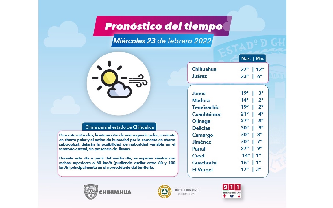 Miércoles 23 Febrero 2022 La Coordinación Estatal de Protección Civil informa el clima para este Miércoles 23 de febrero de 2022.