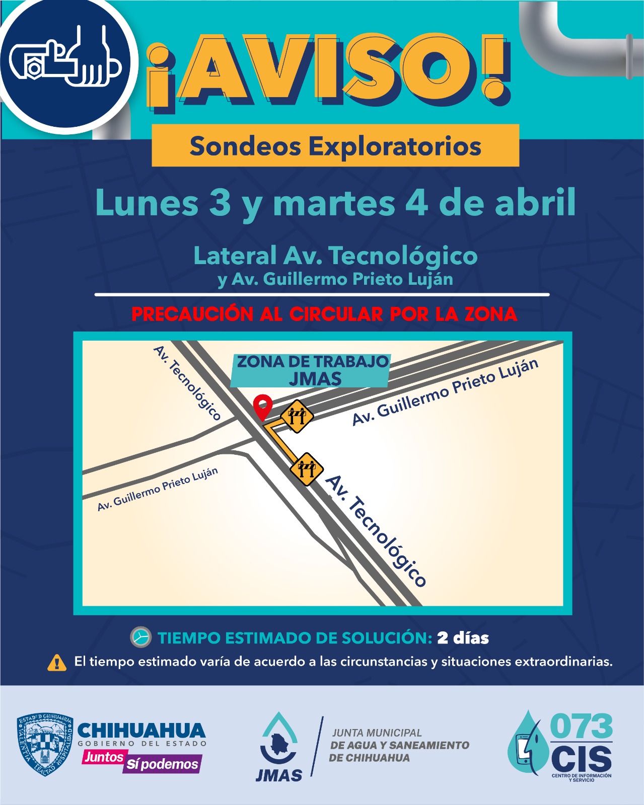 Los días 3 y 4 de abril personal de la Junta Municipal de Agua y Saneamiento (JMAS) de Chihuahua realizará dos sondeos exploratorios en la avenida Tecnológico, a la altura de la av. Guillermo Prieto Luján.