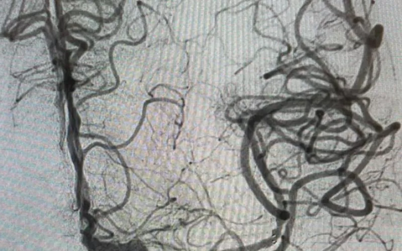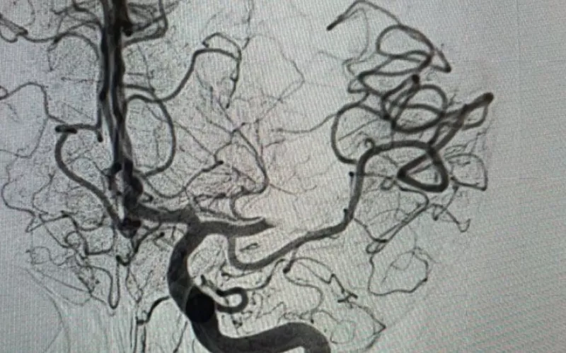 Mediante una resonancia magnética se le detectó la obstrucción de una arteria por un coágulo, fue identificada la zona afectada y se efectuó el rescate que consistió en introducir catéteres desde la ingle hasta el cerebro.