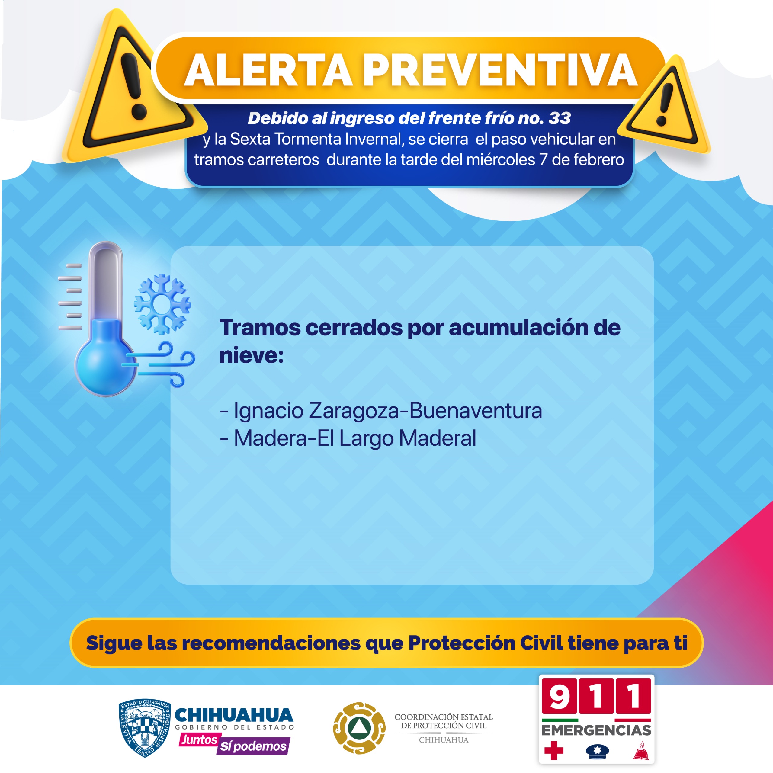 La dependencia informó que, el paso del frente frío No. 33 y la Sexta Temporada Invernal de la temporada, mantendrán el pronóstico de caída nieve, aguanieve y lluvias durante las próximas horas, particularmente en municipios de la Sierra Tarahumara.