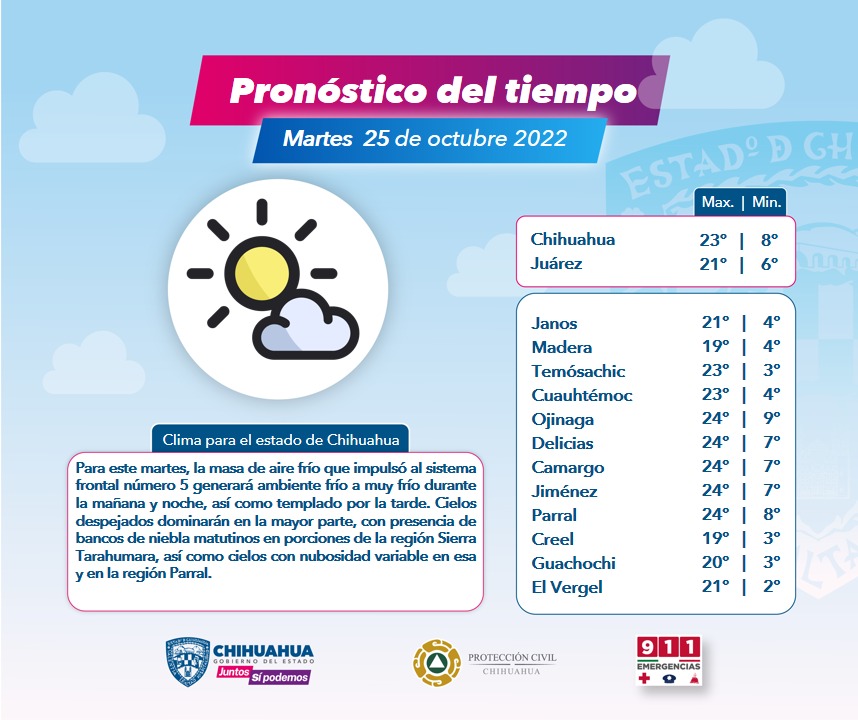 En el transcurso de este martes, la CEPC, refiere que la masa de aire frío que impulsó al sistema frontal número 5 generará un  ambiente de frío a muy frío durante la mañana y noche, así como templado por la tarde, con un cielo despejado que prevalecerá en la mayor parte de la entidad, con presencia de bancos de niebla matutinos en zonas de la región de la Sierra Tarahumara, así como cielo con nubosidad variable en el área de Parral.