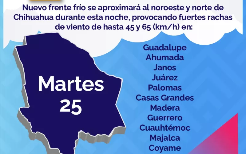 Además, emite un aviso preventivo por la llegada de un nuevo frente frío que se aproximará al noroeste de México durante la noche de este 25 de octubre, lo que provocará fuertes rachas de viento entre los 45 y 65 kilómetros por hora, en Guadalupe, Ahumada, Janos, Juárez, Palomas, Casas Grandes, Madera, Guerrero, Cuauhtémoc, Majalca, Coyame y Ojinaga.