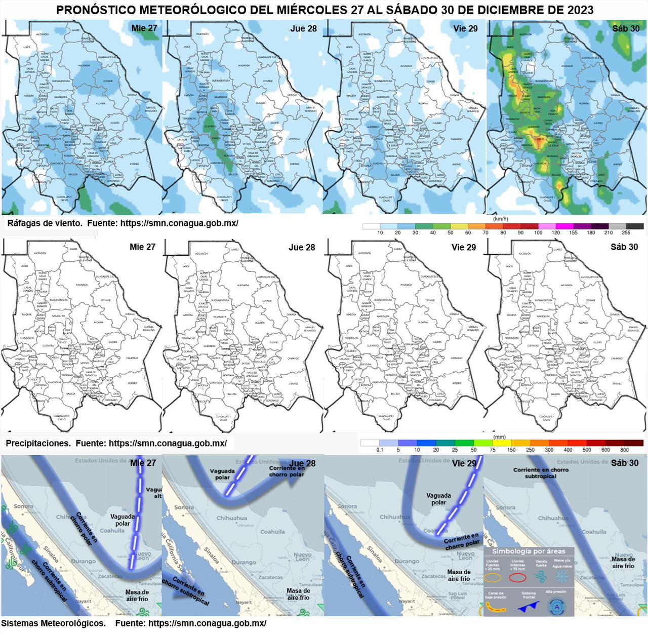 Las temperaturas máximas esperadas para esta tarde de este miércoles 27 de diciembre son (°C): Chihuahua 16, Juárez 13, Janos 13, Madera 13, Temósachic 15, Cuauhtémoc 13, Ojinaga 16, Delicias 16, Camargo 16, Jiménez 16, Parral 16, Creel 13, Chínipas 26, Guachochi 13, El Vergel 12.