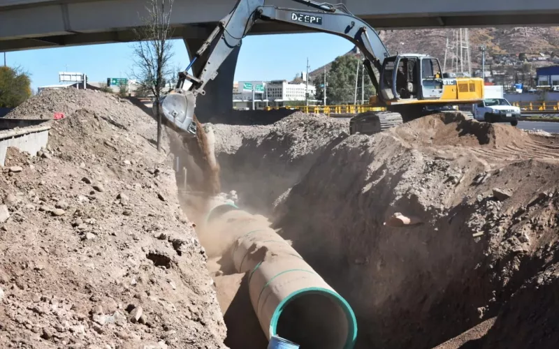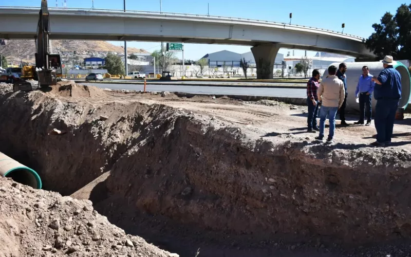 El director ejecutivo de la Junta Municipal de Agua y Saneamiento (JMAS) de Chihuahua, Alan Falomir Sáenz, supervisó los trabajos de reubicación de un tramo del colector Sacramento, a la altura de la avenida Teófilo Borunda, el cual presenta un 64% de avance.