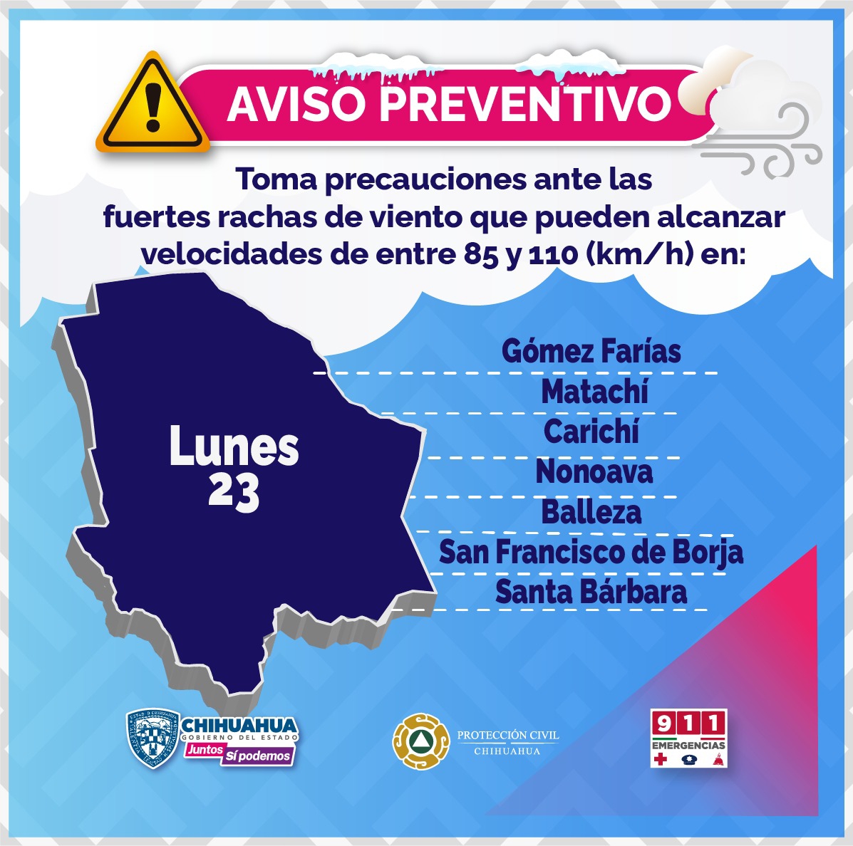 Las ráfagas pueden alcanzar velocidades de entre 85 y 95 kilómetros por hora (km/h) durante este lunes en Ignacio Zaragoza, Nonoava, Santa Bárbara, Casas Grandes, Madera, Galeana, Gómez Farías, Buenaventura, Namiquipa, Guerrero, Carichí, Balleza, San Francisco de Borja, Rosario, Huejotitán y San Francisco del Oro.
