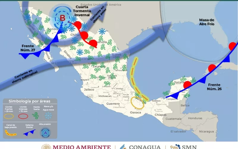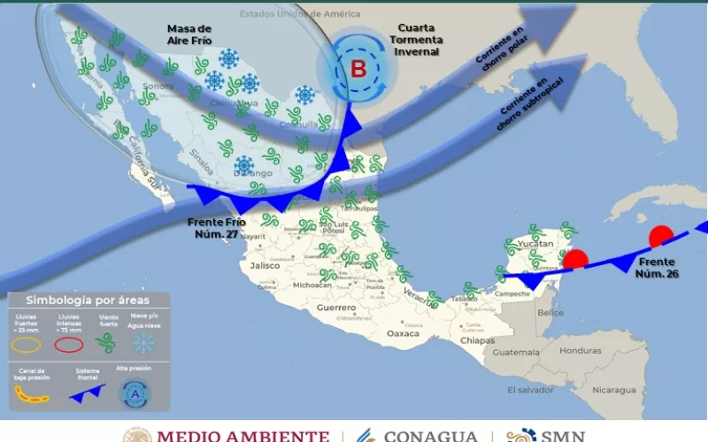 La Coordinación Estatal de Protección Civil (CEPC), indicó que, para este lunes 23 y martes 24 de enero, el ingreso del frente frío número 27 en interacción con la Cuarta Tormenta Invernal, causará un marcado descenso en el valor de las temperaturas en todo estado, además de la posibilidad de presencia de nieve, aguanieve durante este inicio de semana así como intensas rachas de viento.
