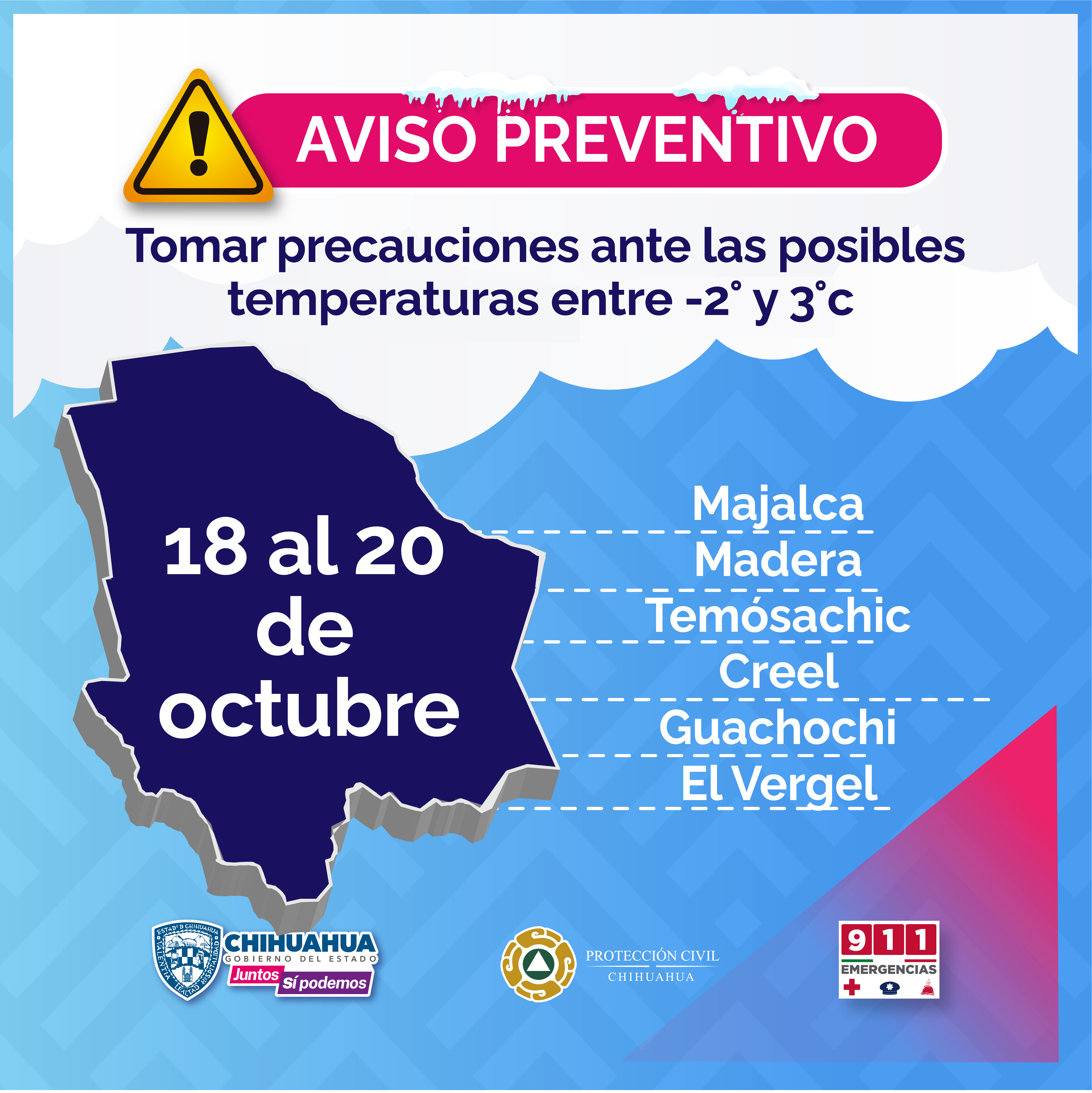 La CEPC, pide a la población mantener las medidas preventivas ante la presencia de lluvias y descenso de temperaturas, ya que los municipios con mayor descenso son Ocampo, Bocoyna, Guerrero, Guadalupe y Calvo y Balleza son las áreas en donde el valor mínimo de temperatura podrá encontrarse entre 0 y 5°C con potencial presencia de heladas.