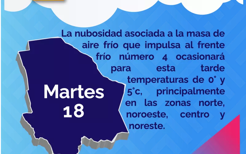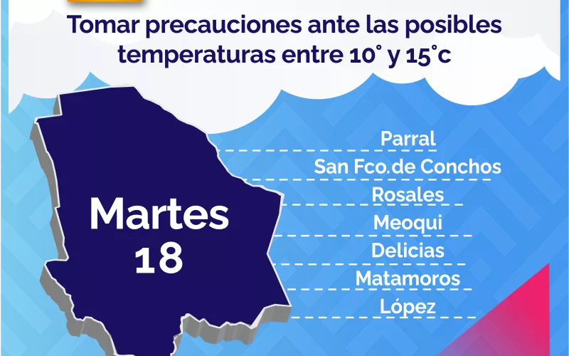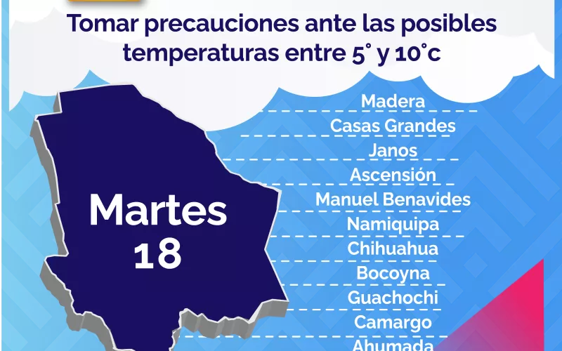 Por otra parte el pronóstico para este día y próximas 72 horas, la masa de aire frío que acompaña al sistema frontal mantendrá la presencia de lluvias en el estado y de un marcado descenso de temperaturas, las cuales podrán tener mayor presencia en el territorio a partir de esta tarde, por tanto, la dependencia estatal emite una alerta ante el pronóstico de temperaturas de -2° y -3° centígrados en Majalca, Madera, Temósachic, Creel, Guachochi y El Vergel.
