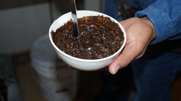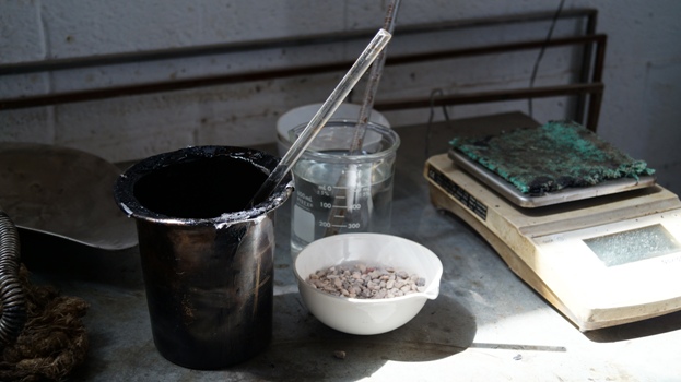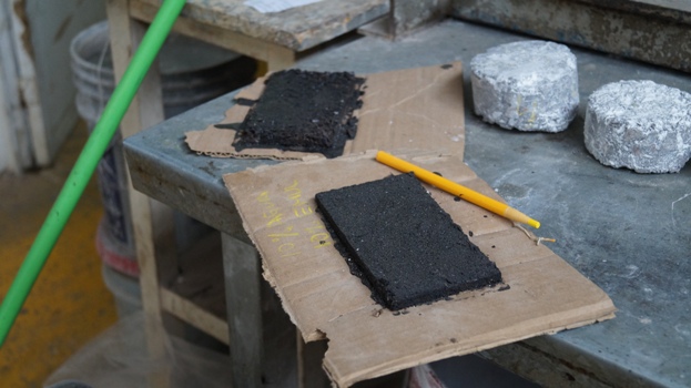 Materiales para micro-carpeta, emulsión y material pétreo. Mezcla de emulsión y material pétreo para microcarpeta. Muestra de micro-carpeta, resultado final. Dependencia Secretaría de Comunicaciones y Obras Públicas