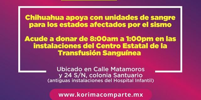 A través de la iniciativa Kórima Comparte, el estado de Chihuahua apoyará a las personas damnificadas por el sismo del pasado 19 de septiembre.