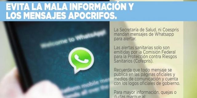 La Secretaría de Salud del Gobierno del Estado de Chihuahua y la Comisión Estatal para la Protección Contra Riesgos Sanitarios (Coespris), informan que las alertas sanitarias no son emitidas por WhatsApp, por esta razón, piden ignorar los mensajes que lleguen por este medio a nombre de alguna de las dependencias del sector.
