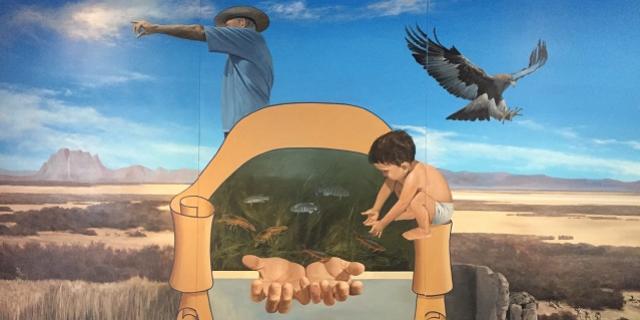 La obra describe la extensión de desiertos y montañas, se observa el escudo del Municipio de Ahumada, en donde se colocan los elementos protagónicos del mural: la conservación de las especies micro endémicas de peces como el cachorrito de carbonera y la carpita boca grande, además de crustáceos como el acocil chihuahuense y sus ecosistemas acuáticos.