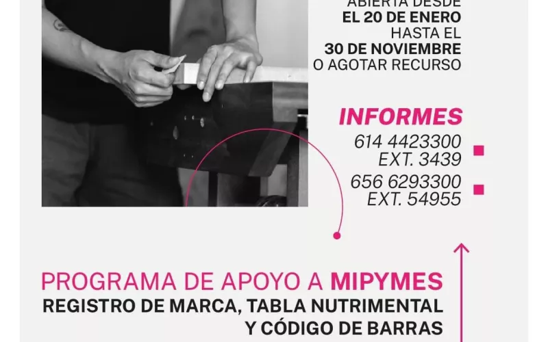 El pasado 20 de enero, la Dirección de Emprendimiento y Desarrollo Empresarial abrió la convocatoria del Programa de Apoyo a MiPyMES para el registro de marca, estudio microbiológico, tabla nutrimental y código de barras, dirigido a empresas de giro industrial, agroindustrial, artesanías, comercio y servicios. La convocatoria y los formatos para aplicar a este programa se encuentran en: www.chihuahua.com.mx