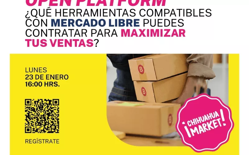 En el marco de la alianza entre Gobierno del Estado y Mercado Libre, y con la finalidad de promover la comercialización de productos chihuahuenses en línea, se invita al curso virtual gratuito “Open platform ¿Qué herramientas compatibles con Mercado Libre puedes contratar para maximizar tus ventas?”, el cual se llevará a cabo este lunes 23 de enero, 16:00 horas. La liga de registro es: https://mercadolibre.zoom.us/webinar/register/WN_OJ-uiabXSTa4oSEWjoJYSw