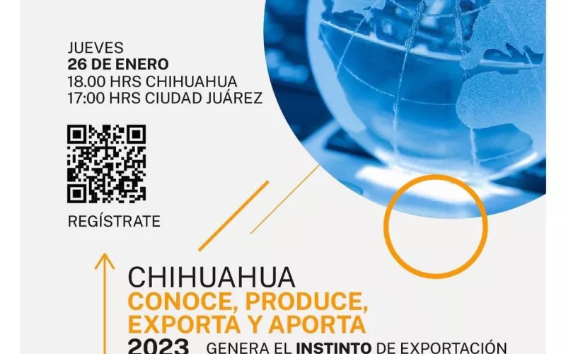 Además, junto a Customs Trade Training, se invita a empresas con interés de exportar sus productos, a la capacitación en línea “Chihuahua conoce, produce, exporta y aporta 2023, genera el instinto de exportación”, el próximo jueves 26 de enero a las 17:00 horas de Ciudad Juárez y 18:00 horas de Chihuahua. El registro se realiza en: www.bit.ly/3HiUyUT