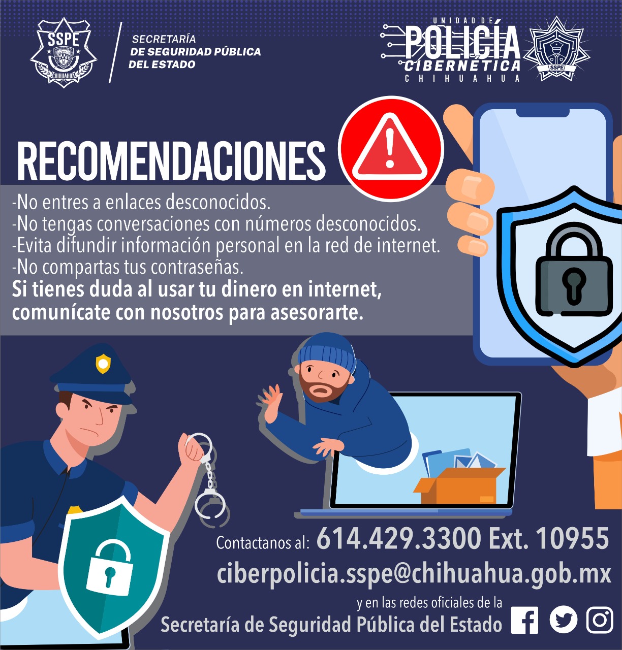 Para más información y denuncias se pone a disposición el número de teléfono 614-429-33-00 en la extensión 10955 y el correo electrónico ciberpolicia.sspe@chihuahua.gob.mx.