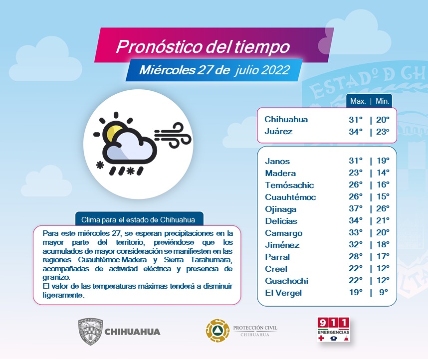Con base a la información emitida por el Servicio Meteorológico Nacional, la Coordinación Estatal de Protección Civil (CEPC) informa que la presencia del fenómeno denominado “monzón mexicano”, ocasionará lluvias muy fuertes, con descargas eléctricas y posible caída de granizo en las regiones de Cuauhtémoc, Madera y la Sierra Tarahumara, principalmente.