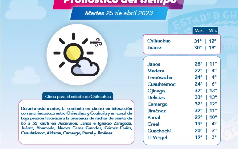 Con base en la información emitida por el Servicio Meteorológico Nacional, la CEPC dio a conocer que las ráfagas de viento pueden superar los 65 y 70 kilómetros por hora (km/h), en municipios como Ascensión, Janos, Camargo y Jiménez, particularmente durante los días lunes 24 y martes 25 de abril.