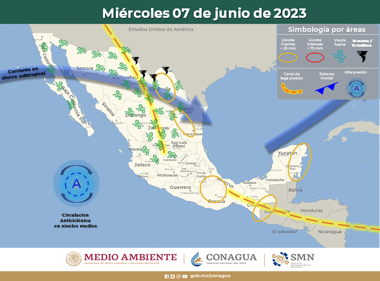 La CEPC detalla que, con base en la información emitida por el Servicio Meteorológico Nacional (SMN), una corriente en chorro y la entrada de humedad procedente de ambos litorales favorecerá un ambiente caluroso por la tarde.