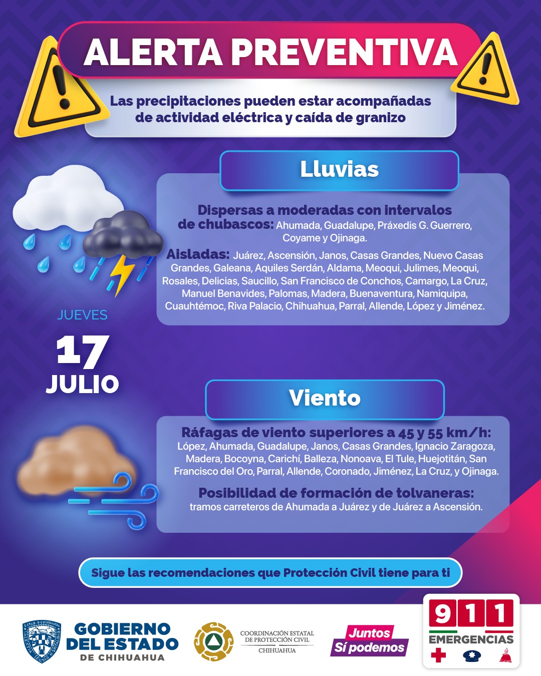 Este jueves se prevén ráfagas de viento superiores a los 45 y 55 km/h, con posibles tolvaneras en la zona sureste. Además, se esperan precipitaciones de dispersas a moderadas que podrían estar acompañadas de actividad eléctrica y posible caída de granizo en gran parte del estado.