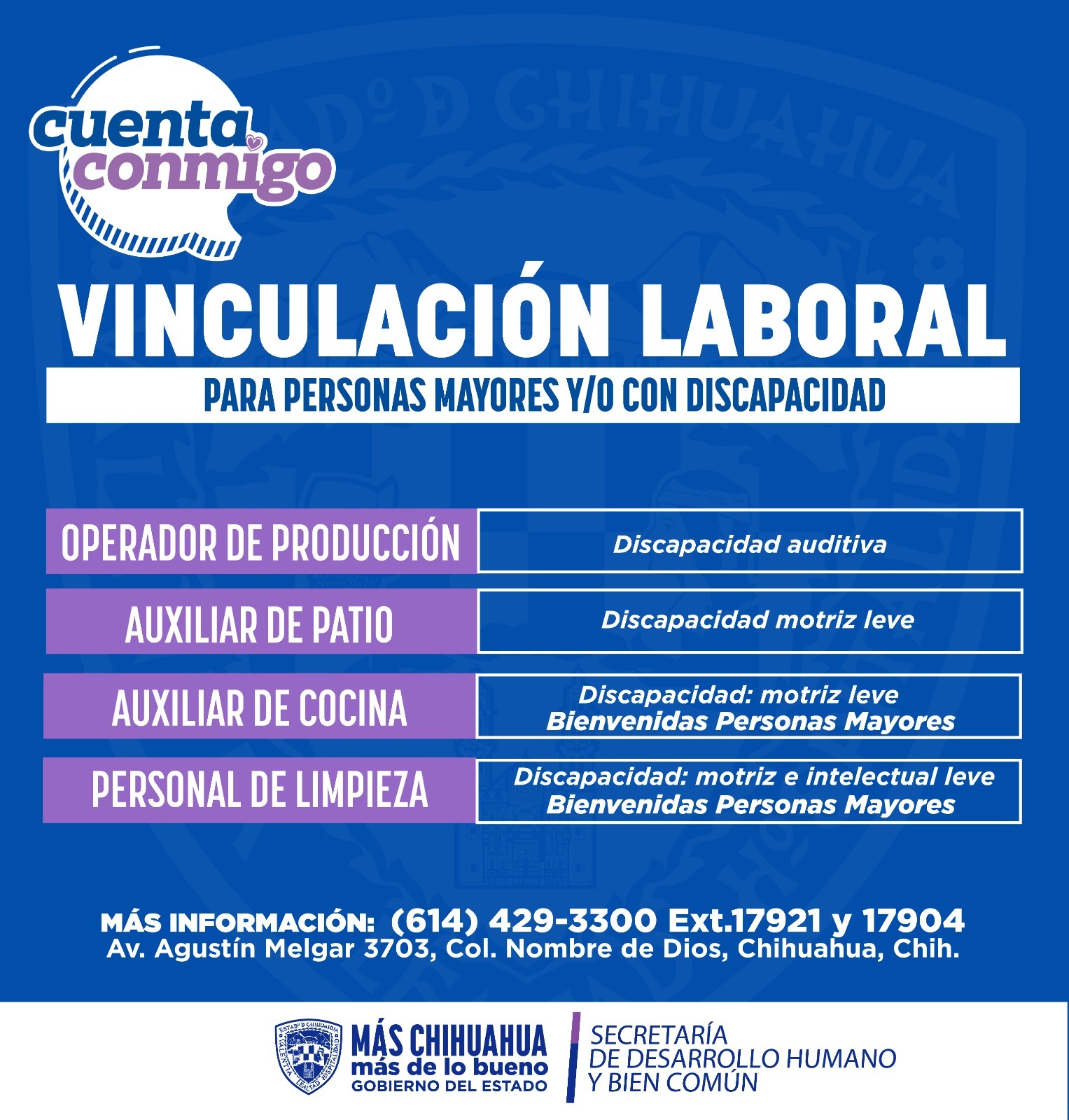 La Secretaría de Desarrollo Humano y Bien Común (SDHyBC), en colaboración con la iniciativa privada anunció la apertura de nuevas vacantes dirigidas a personas con discapacidad y adultas mayores en la ciudad de Chihuahua.
