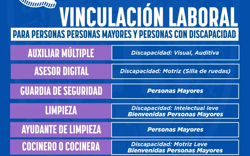 También hay con oportunidades para desempeñarse como guardias de seguridad, dirigidas a adultos mayores y en el área de limpieza, para personas con discapacidad intelectual leve y de la tercera edad.