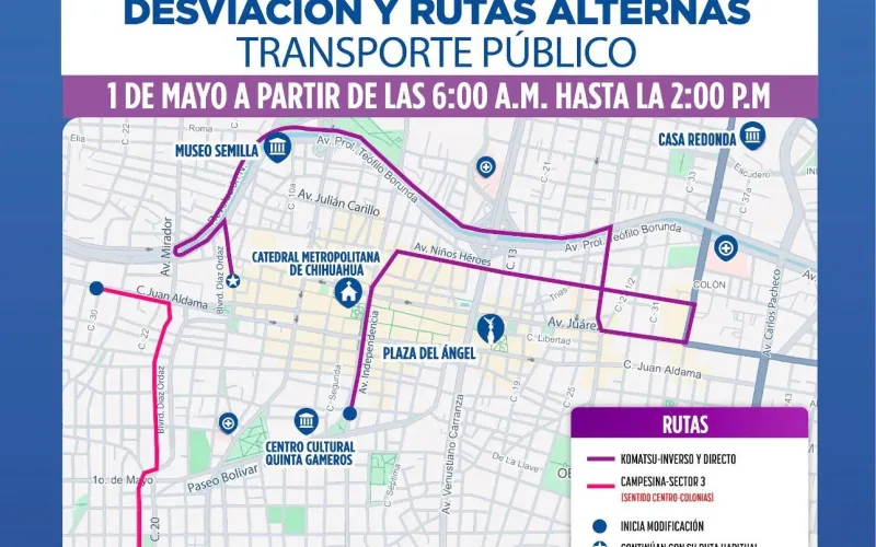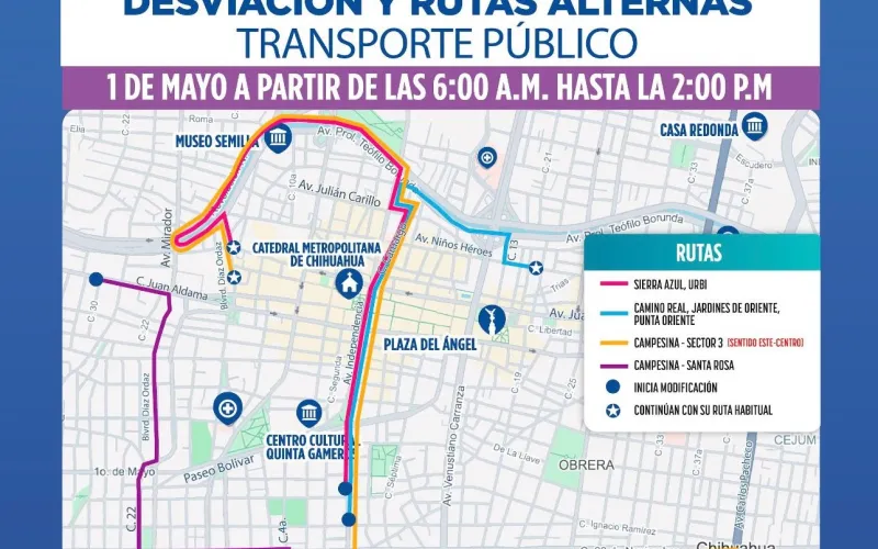 La Secretaría General de Gobierno, a través de la Subsecretaría de Transporte informó que con motivo del desfile por el Día de Trabajo, este viernes 1 de mayo habrá modificaciones en las rutas del transporte colectivo a su paso por el centro de la ciudad.