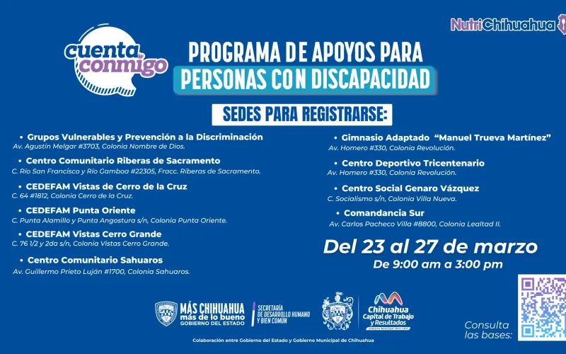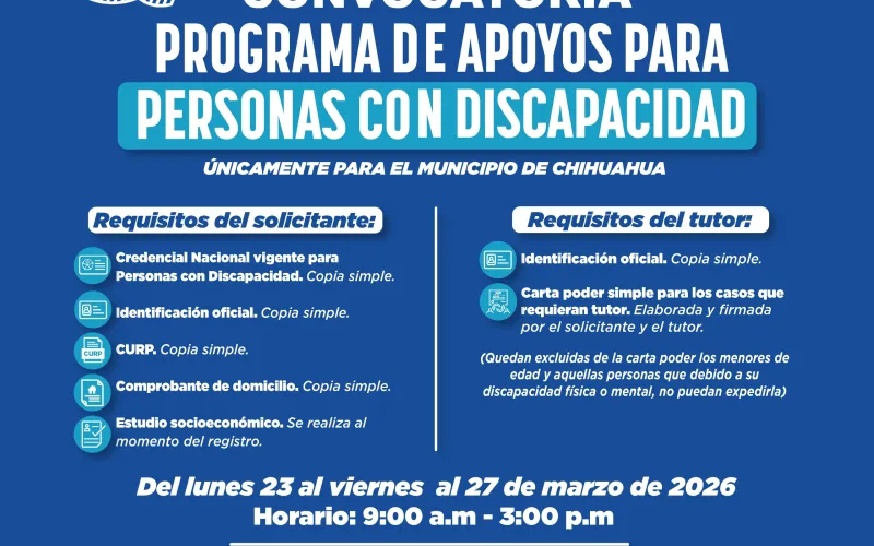 Con el objetivo de contribuir al desarrollo de personas con discapacidad permanente, el Gobierno del Estado y el Municipio de Chihuahua anunciaron de manera conjunta la convocatoria para el programa “Apoyo Económico a Personas con Discapacidad 2026”.