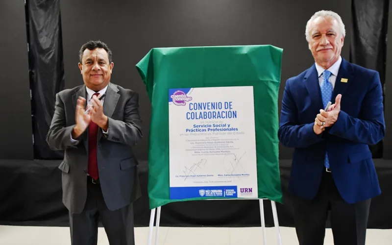 El documento suscrito por Márquez Lizalde y Carlos González Montijo, rector de la URN, permitirá que 50 alumnas y alumnos de la carrera de Psicología de la institución de nivel Superior, atiendan a estudiantes en las escuelas preparatorias del estado.
