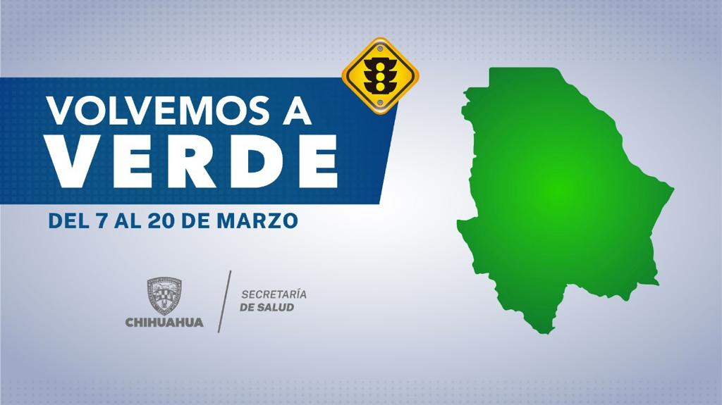 La Secretaría de Salud del Estado de Chihuahua informa que a partir del lunes 7 de marzo la entidad transitará a semáforo epidemiológico verde, esto tras la disminución de casos, hospitalizaciones y defunciones por COVID-19.
