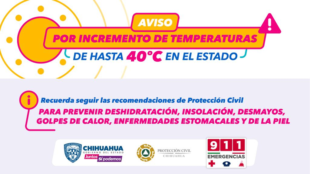 Entre sábado y domingo para la ciudad de Chihuahua se pronostican de 35°C a 36°C, en Ciudad Juárez de 34°C a 35°C, Ojinaga de 38°C a 40°C y en municipios de la zona subtropical de 35°C a 37°C.