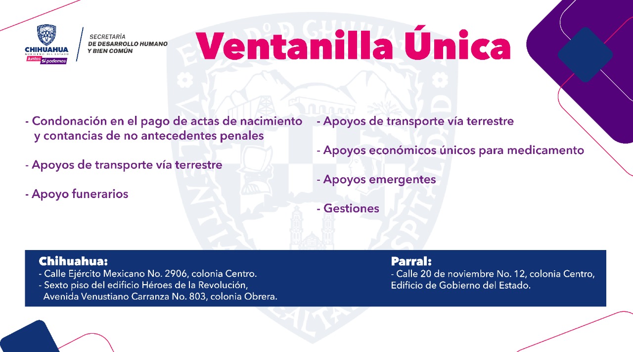 Las Ventanillas Únicas de la SDHyBC en Chihuahua Capital, están ubicadas en la ciudad de Chihuahua en calle Ejército Mexicano No. 2906, colonia Centro, y en el sexto piso del edificio Héroes de la Revolución, en Avenida Venustiano Carranza No. 803, colonia Obrera; y en el municipio de Parral, en calle 20 de noviembre No. 12, colonia Centro.