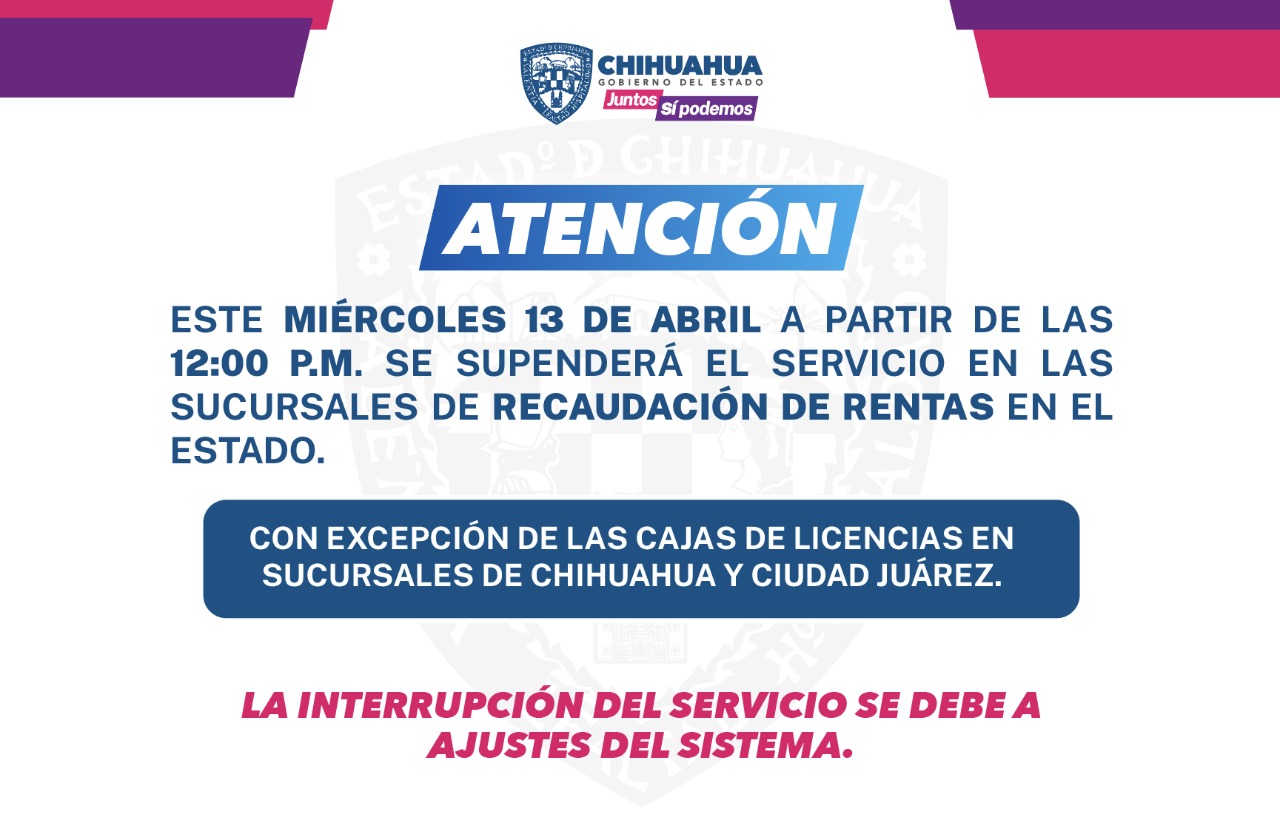 Asimismo, para el pago de licencias en Chihuahua y Ciudad Juárez, se mantendrán abiertas las cajas de la misma área, para que así, los contribuyentes que cuentan con cita para el día de mañana, puedan llevar a cabo sus trámites sin ningún problema.
