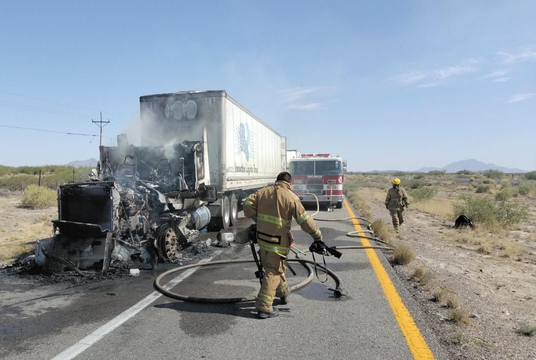 El vehículo procedente de Juárez se dirigía al estado de Puebla, cuando se le reventó una llanta. La fricción del rin con el pavimento generó chispas y originó el incendio de la cabina. Por fortuna, el chofer salió ileso del percance.