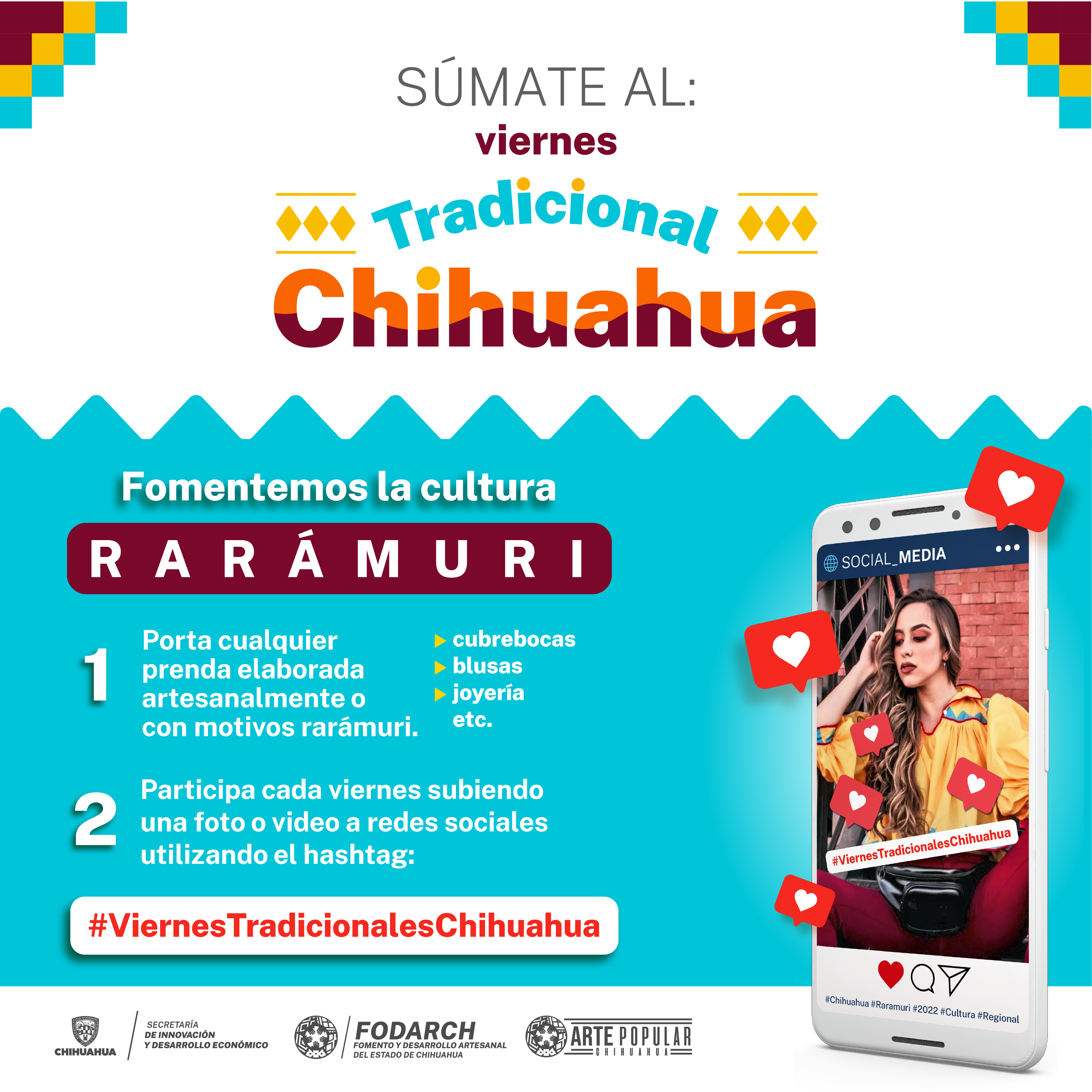 -Llaman a la comunidad a utilizar prendas con motivos rarámuri, tomarse foto y compartirla por redes sociales con el hashtag #ViernesTradicionalesChihuahua  para enaltecer esta cultura