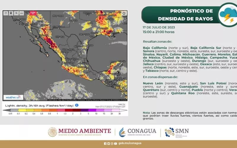 Estas lluvias también podrían estar acompañadas de actividad eléctrica y posible caída de granizo.