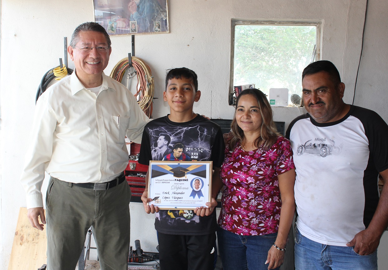 Erick Alexander López Vázquez, estudiante que acaba de concluir la primaria con un promedio de aprovechamiento general durante los seis años de 9.9, fue visitado por Óscar Ibáñez Hernández, representante del Gobierno del Estado en la Zona Norte.