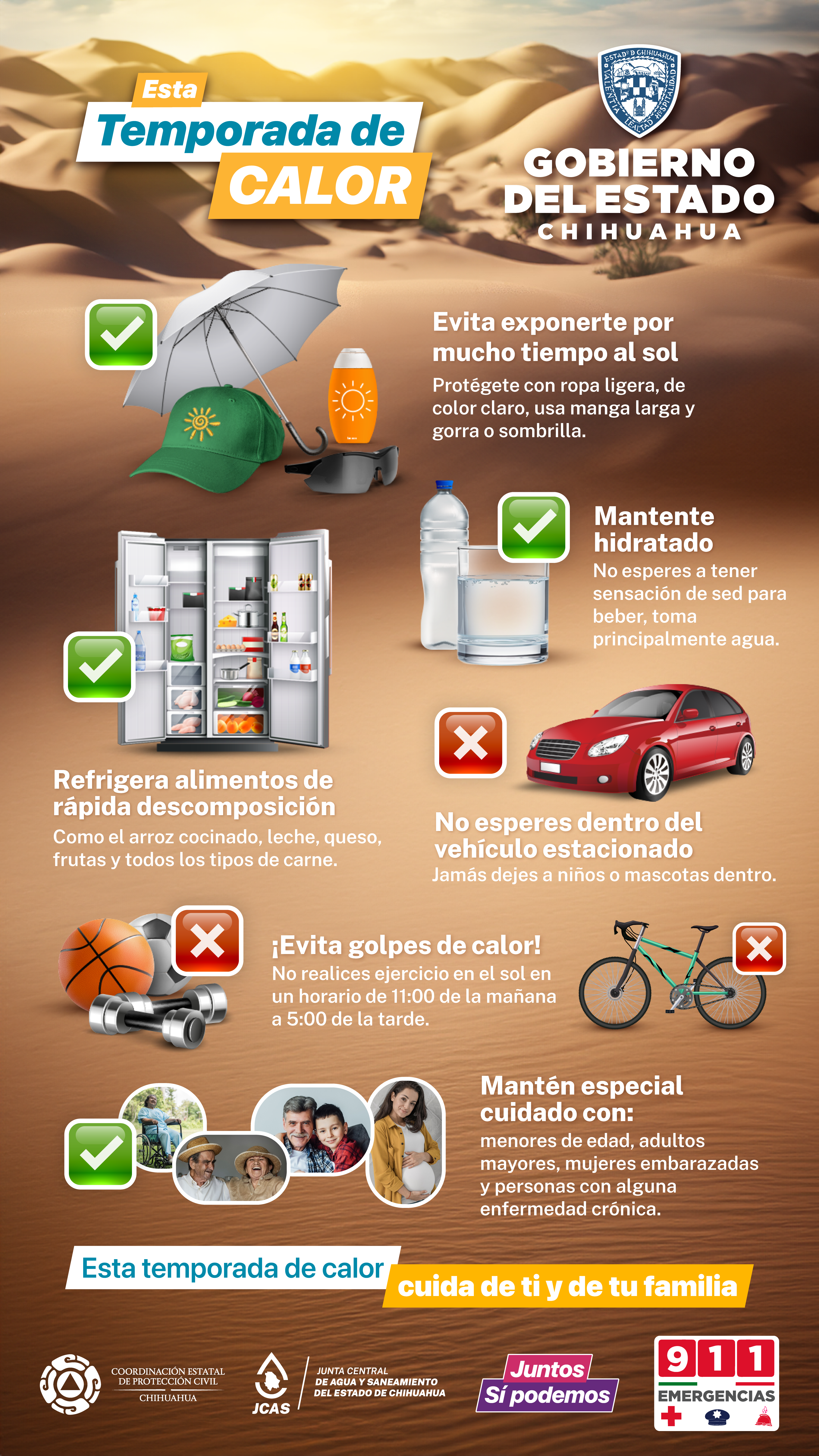 La CEPC reitera que es importante generar conciencia propia y en la familia, para atender las recomendaciones que emiten las autoridades durante la temporada de calor. En caso de alguna emergencia comunicarse al 9-1-1.