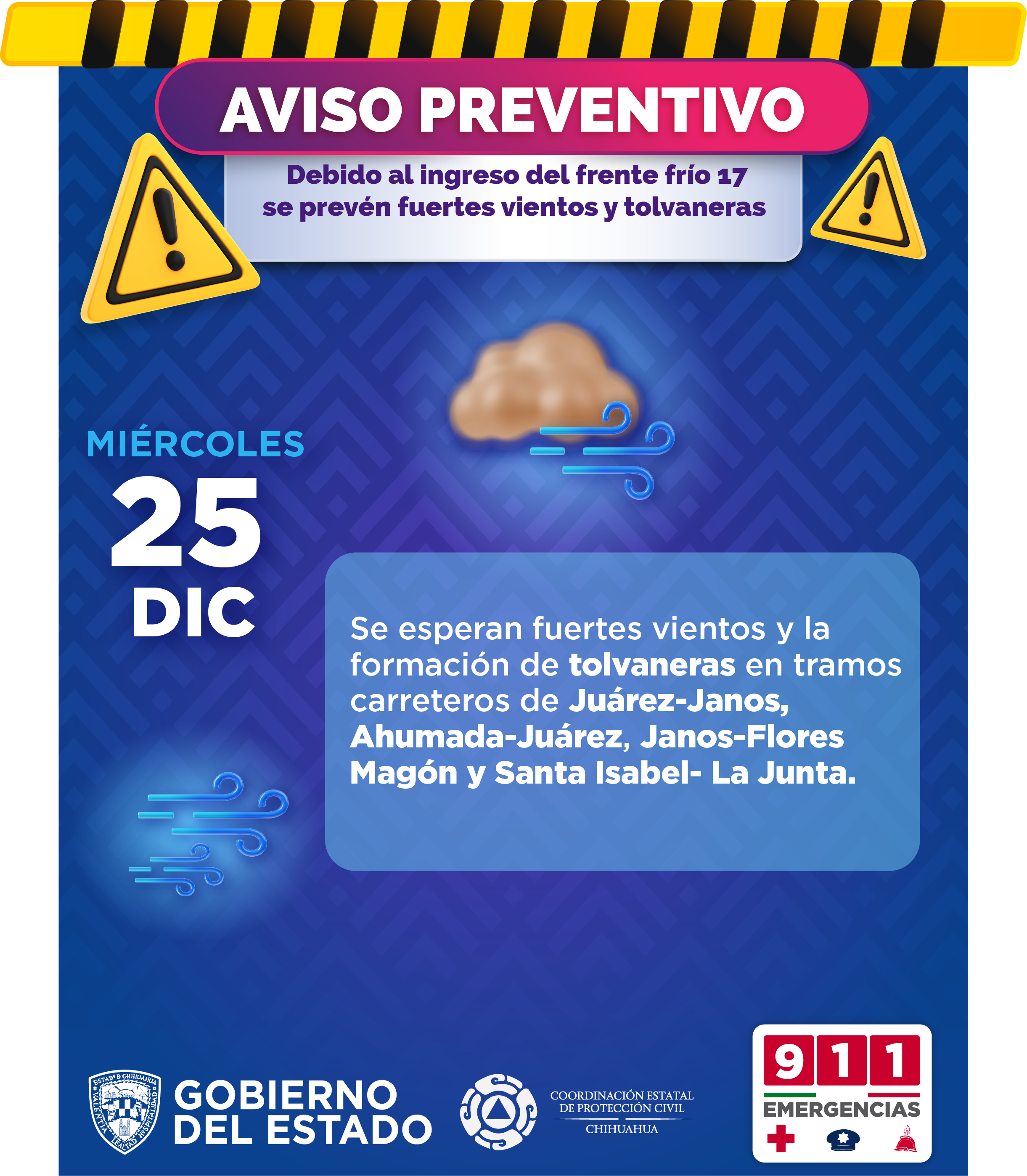 Para 25 de diciembre la CEPC advierte a la población ante el ingreso por la noche del frente frío número 17 a la entidad, que generará vientos con rachas de hasta 75 km/h en Janos, Casas Grandes, Nuevo Casas Grandes, Galeana, Ignacio Zaragoza, Gómez Farías, Namiquipa y Bachíniva.