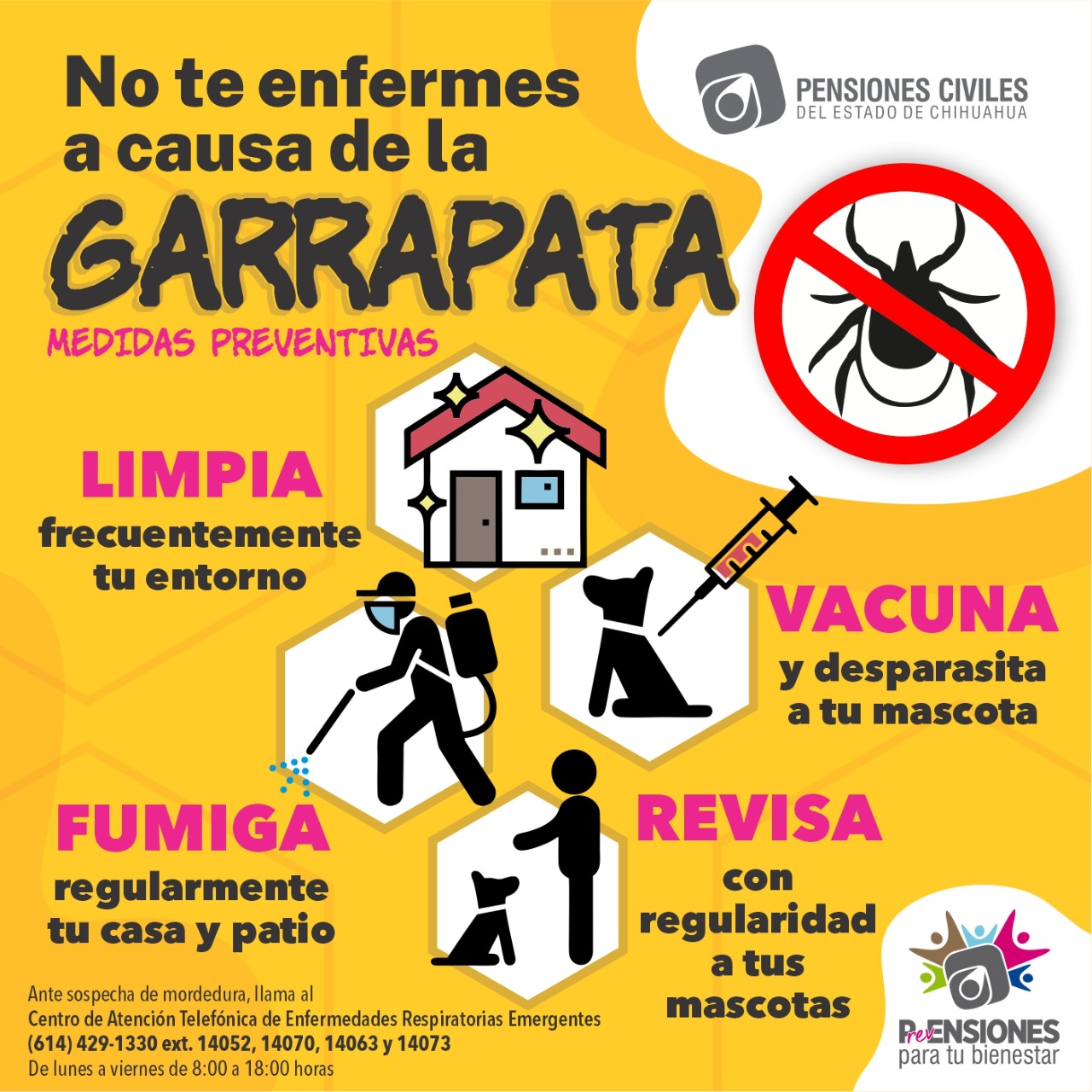 Ante cualquier sospecha de mordedura de garrapata o si presenta síntomas, acudir de inmediato al área de Urgencias o llamar al Centro de Atención Telefónica de Pensiones Civiles del Estado al teléfono (614) 4291330 extensiones 14052, 14070, 14063 o 14073.
