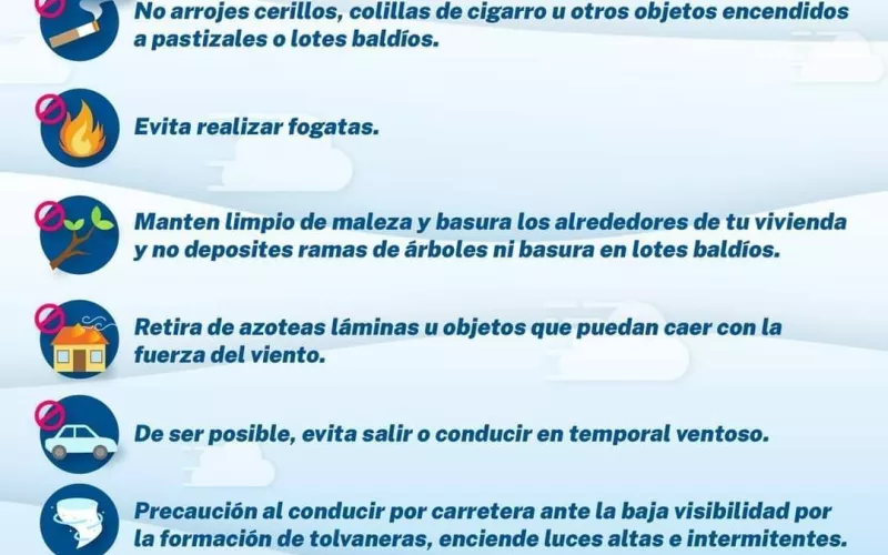 No realizar fogatas y no arrojar colillas de cigarro encendidas, ya que pueden desencadenar incendios de gravedad. Manejar con precaución, encender las luces intermitentes en caso de presencia de tolvaneras o bien aplazar el viaje. En situación de emergencia llamar al 9-1-1.